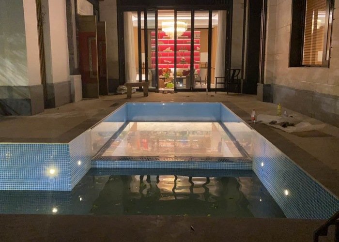 The ingenious design of the transparent glass-bottomed swimming pool is truly eye-catching. Instead of traditional tile flooring, it features seamless, full-sized acrylic panels. This allows swimmers to easily glimpse the environment below with just a slight dip of the head, providing a wonderfully surreal visual experience that's thrilling. Moreover, from the perspective of someone sitting on the lower level, the suspended transparent glass-bottomed pool seamlessly merges with the sky, offering an unobstructed panoramic view that's simply stunning.The transparent glass-bottomed swimming pool in the courtyard utilizes Aupool acrylic panels, which are seamlessly integrated for a flawless finish. Considering the strong UV rays outdoors, Aupool employs specially designed outdoor acrylic panels that guarantee no yellowing, cracking, or even whitening for up to 30 years! Aupool maintains strict quality control standards, ensuring both durability and visual appeal.