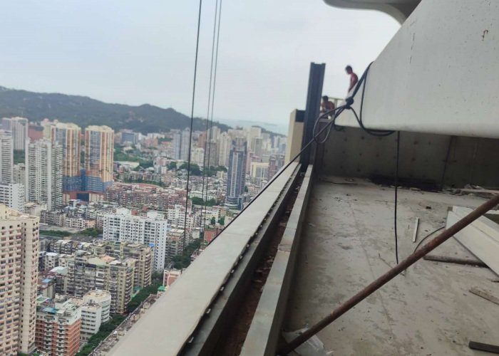 The critical aspect of the project lies in hoisting the acrylic panel to the steel platform, with a straight span of approximately 66 feet and a vertical height of about 545 feet. Considering the strong winds at high altitudes, the installation team, based on equipment performance calculations, determined the need to use a mast and winch to lift the acrylic panel to the steel structure opening on the 44th floor. Ultimately, it took 3 days to successfully hoist the two 4.7-ton acrylic panels to the 44th-floor steel platform.