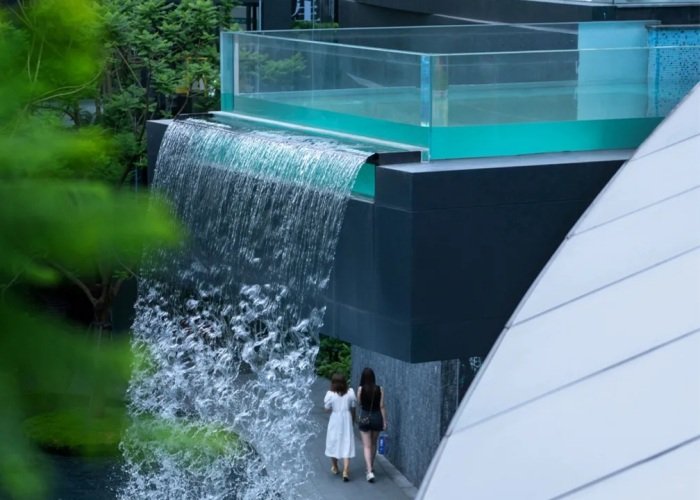 Using an extended glass-bottom swimming pool to create a waterfall in the canyon, the acrylic glass-bottom swimming pool creates a graceful and undulating spatial feeling in different dimensions.